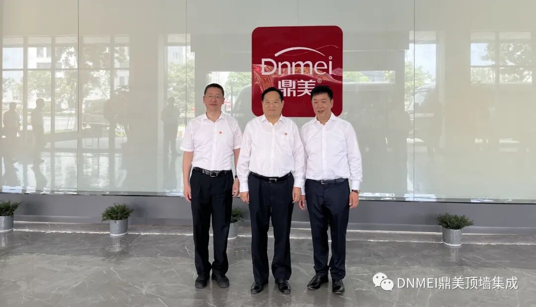 随后,张兵书记一行参观了鼎美品牌研发中心最新展厅,张轲讲述了鼎美从2002年生产单一的卫生间浴霸产品到集成吊顶到目前的顶墙集成(鼎美是装配式吊顶和墙面集成技术的发明者)再到未来的一站式装配式装修的实现。在企业使命和责任担当的驱使下鼎美不断创新发展,今年在无胶大板和木泥蜂巢板的基础上,推出了行业里程碑式的产品——卡扣式无胶大板、铝岩板和铝蜂窝柜体板,在传统家装基础上实现了公装和商装领域新的赛道跃升。