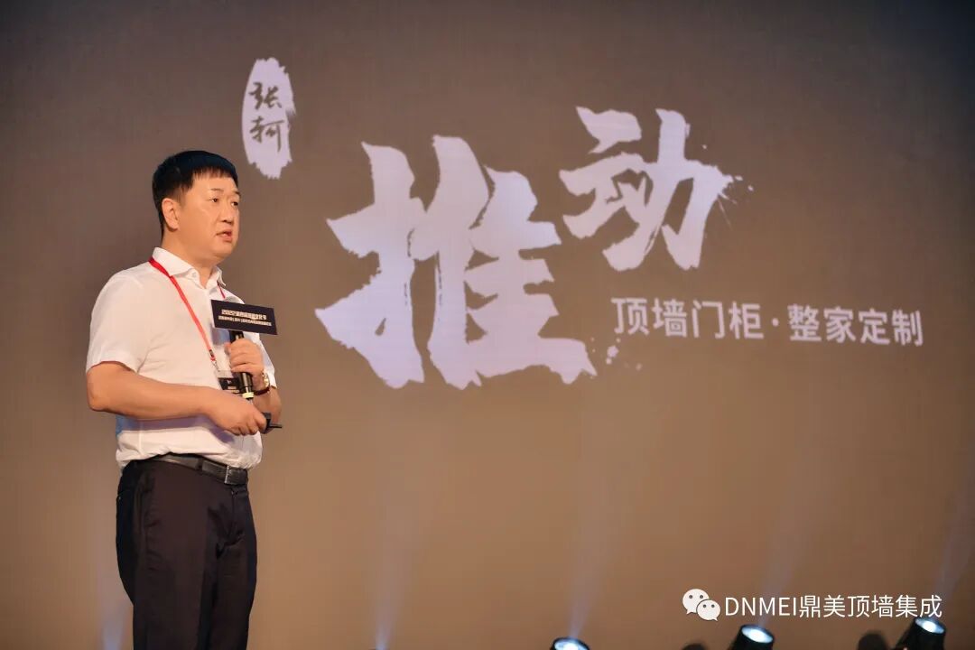 中国建筑装饰装修材料协会副会长兼天花吊顶材料分会执行会长、鼎美董事长张轲发表了以“王店集成装饰产业—推动顶墙门柜·整家定制”为主题的演讲,并以鼎美的产品为例,阐释了装配式顶墙门柜呈现的效果,倡导各大品牌重新思考目标价值,定义组织,注入活力,激发动能,重启创业创新再启征程的决心。