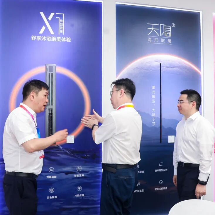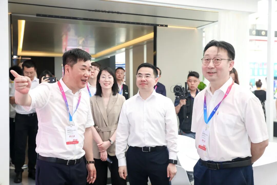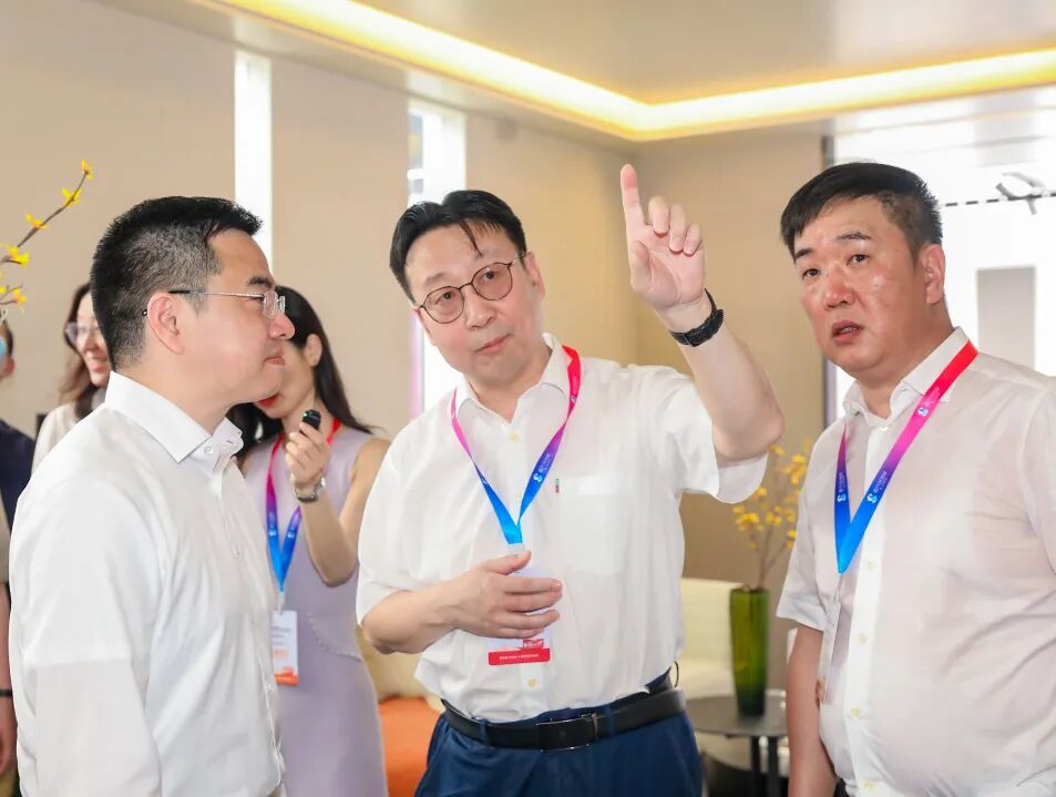 鼎美董事长张轲先生为住房和城乡建设部科技与产业化发展中心处长、绿色建材产品认证技术委员会主任刘敬疆先生和嘉兴市人民政府副市长倪沪平先生介绍鼎美装配化顶墙门柜体系产品。