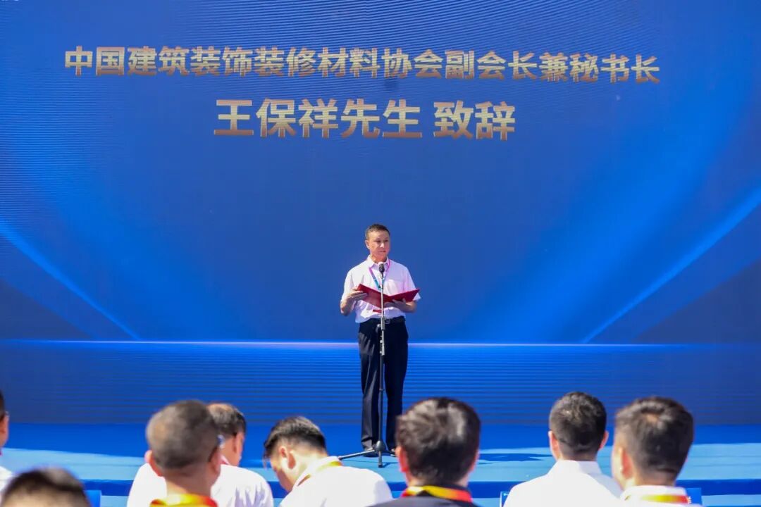 在嘉兴展开幕仪式中,中国建筑装饰装修材料协会副会长兼秘书长王保祥先生发表讲话:指出装配化是未来,特别提到在近期走访鼎美中,对其加快进入装配化产业实际应用深受感触,号召相关企业要积极转型升级,促进装配化产业高质量发展。